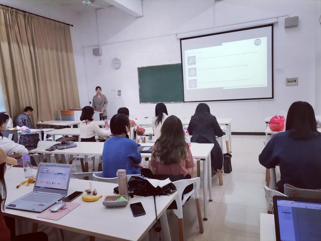 评委老师分别对大家的汇报内容进行点评分析,高度肯定了同学们选题丰富、准备充分,同时也指出大家在汇报时出现的一些问题,并建议同学们在开展学术研究的过程中,要注意培养自己的创新能力,拓宽自己的学术视野,充分利用自己的学科知识进行项目研究,同时要多加提升自己做学术报告的能力。在提问和讨论环节,导师们耐心为同学们答疑解惑,同学们畅所欲言,纷纷表示此次翻译沙龙意义非凡,不仅提高学术素养,而且锻炼了自己演讲的能力。