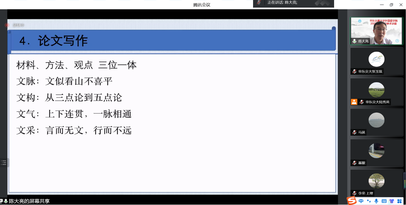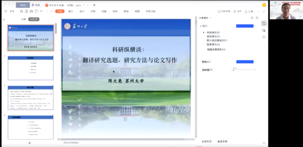 2022年6月15日14:30,苏州大学特聘教授、博士生导师陈大亮教授为我院师生带来了一场题为《科研纵横谈:翻译研究的选题、方法与写作》的学术讲座。本次讲座线上进行,由yl9193永利集团副院长陆秀英教授主持,学院教师、翻译硕士研究生及外校师生约300人参加。