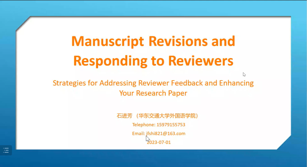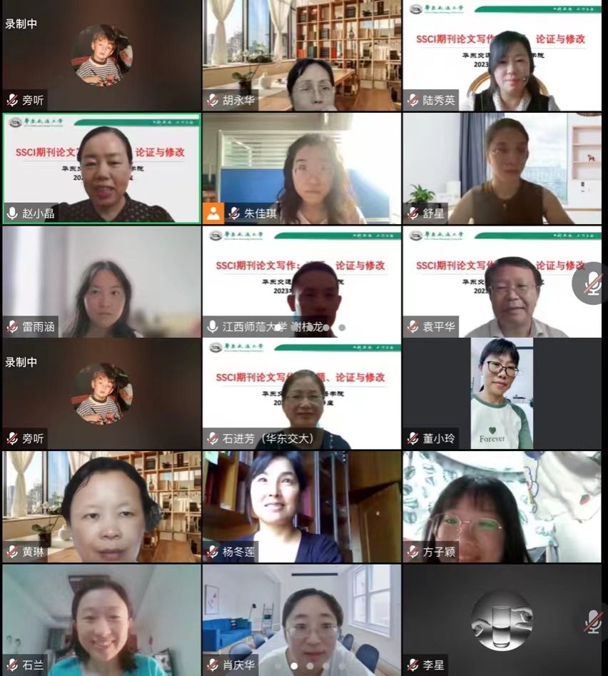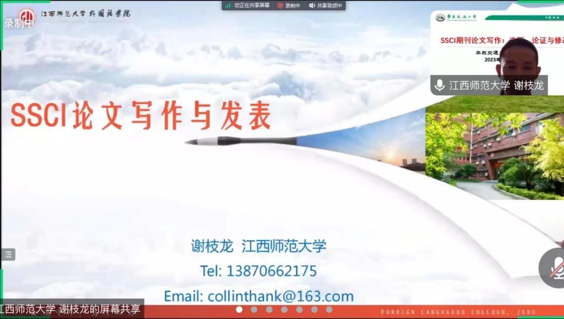 为加强学院学科建设,增强师生对国际期刊论文写作的了解,2023年 7月3日学院举办了主题为“SSCI期刊论文写作:选题、论证与修改”的系列学术讲座。讲座以线上形式进行,由江西师范大学谢枝龙教授、湖南师范大学肖越海教授和永利集团石进芳教授进行主旨发言,围绕SSCI期刊论文选题、资料搜索、文献阅读与写作、数据收集与实验、数据统计与分析、语言文字与撰写、投稿格式与要求、期刊选择与投稿、审稿意见的修改与回复等层层展开。系列讲座分别由外语学院赵小晶、袁平华、陆秀英老师主持。