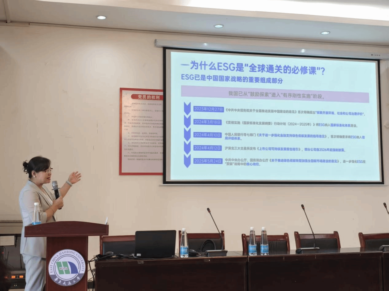 张丽介绍ESG通过三重维度赋能企业:战略层面,欧盟碳关税等国际法规重塑经贸标准,2025年未获ESG认证的出口企业将面临市场准入壁垒;金融层面,ESG评级通过绿色信贷利差(1-3%)直接影响融资成本;品牌层面,全球83%消费者将ESG纳入采购考量,中国企业亟待构建符合ISO 26000等国际标准的溢价体系。她强调“ESG是企业参与全球产业链的核心竞争力”。