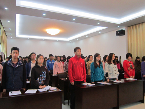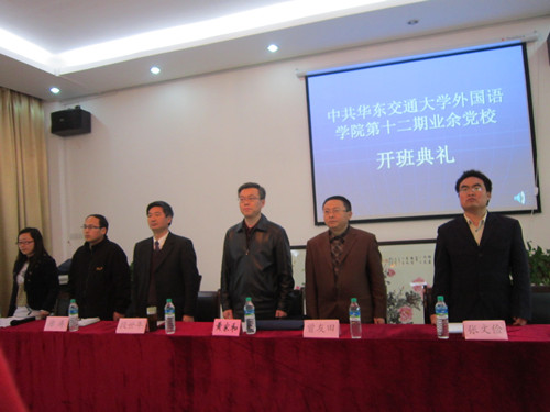 开班典礼在主持人张颖的主持下有序进行。第一项内容为全体起立奏国歌。在众嘉宾的肃穆起立中,义勇军进行曲缓缓响起。紧接着,黄家和老师发表讲话, 提出自己对入党目的,入党学习,怎样学习的认识及意见。黄家和指出入党是为了培养一批真才实学,有坚定社会主义信念的共产主义者,党课期间将学习党的基本 知识理论,并积极主张大家端正学风,加强学习,端正入党动机,积极思考,加强修养,严格自律。开班典礼第三项由11级国贸2班左云珂代表学生发言,她号召大家珍惜此次入党学习机会。