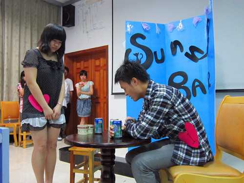 10国贸2班的精彩表演 在一曲甜美可爱的歌曲《Little Love》后,比赛继续如火如荼地展开。随后的作品《Loving your shoes》贯穿了中国食品安全、泰坦尼克号等热点话题,创意十足,颇具现实意义。而紧接下来的第五组演员则借用了大话西游的场景,人物扮相幽默可爱,情节夸张风趣。最后一组的表演同样吸引人的眼球。万能的老板以人的灵魂、健康、快乐为条件与人进行交换,贪婪的人们最终后悔不已。物质的富足不能给人真正的幸福,追求精神的富足才是人生的真谛。在一场精彩的魔术表演中比赛拉近尾声。