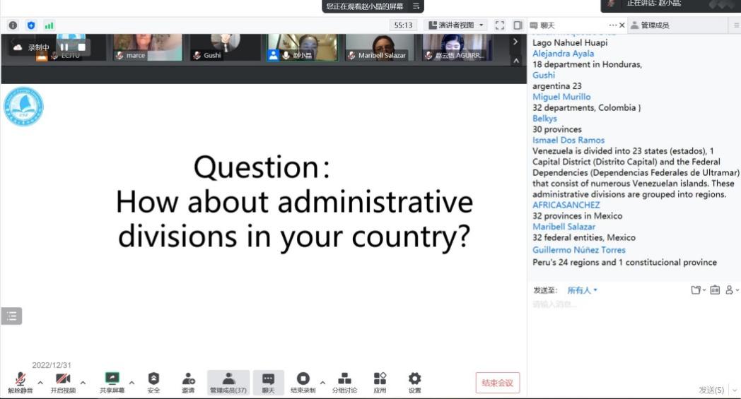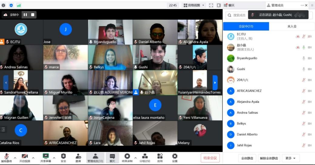 赵小晶老师为学员讲述了中国概况,通过介绍中国国庆节、国旗国徽及国情等调动大家的积极性,在互动中交流。学员们在聊天框中介绍了自己国家的各项国情,美洲多国青年相聚于本次夏令营,也加深了对邻国的了解。语言是一种沟通工具,也是一种交际手段。学员们在此汇聚交流,学习更多的中文表达和中华文化。同时,他们也在这里尽情地展示自己国家的精彩文化、培养自己的兴趣爱好、结识更多的朋友。灿烂纷呈的美洲文化与熠熠生辉的中华文化在此交融,开出了绚丽的文明之花。