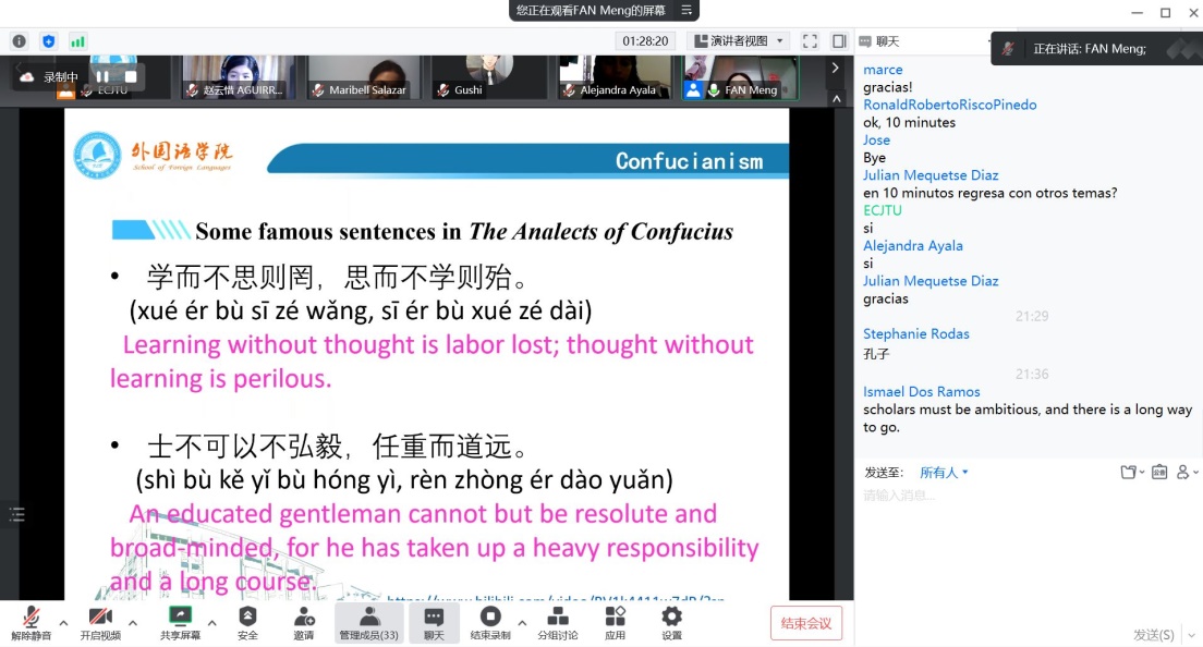 第二节文化讲座主题为《中国古代哲学思想》,yl9193永利集团樊梦老师从百家争鸣出发,讲解了各个朝代的哲学观点。樊梦老师生动的讲解使深奥的哲学思想变得通俗易懂。哲学源于生活,启发着各位学员思考生活。中国古代哲学思想这一文化符号对我国人民的生活及思维方式都有着极为深刻的影响,在一代代的传承中也早已深入中华儿女的骨髓之中,表现在中国人民的一言一行当中。樊梦老师对中国古代哲学思想的剖析使得一个个中华儿女生动立体了起来,也使得美洲学生们明白了我们骨子里的信仰、行为的源头。
