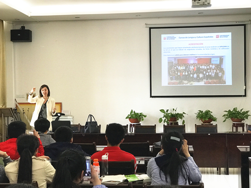 访问期间,Cristina女士还同外语学院英语-西班牙复语专业学生开展互动交流,她向学生介绍了拉里奥哈大学的专业、学科和学生生活情况以及西班牙的教育、文化和风土人情,受到学生们的热烈欢迎。