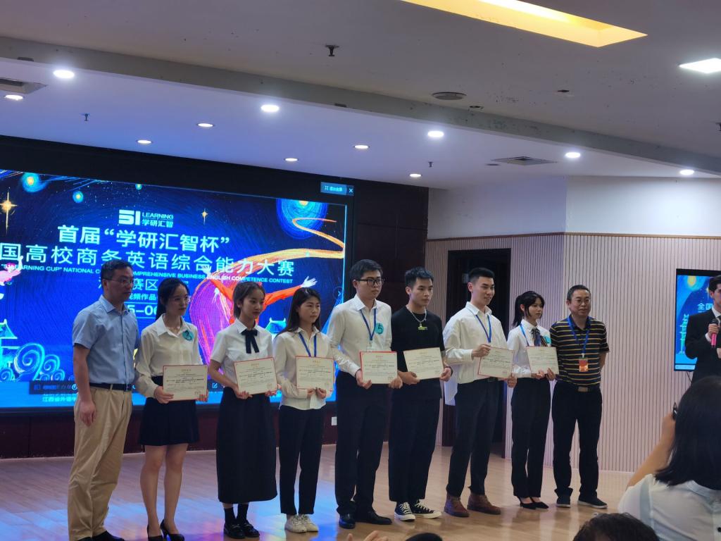 6月6日,首届“学研智汇杯”全国高校商务英语综合能力大赛(微视频作品赛项)省级复赛举行。此次比赛共有29个参赛学校,经过激烈角逐,由我院2018级英语(国贸)专业曹静、刘葳、许梦丹、罗智文、张壮壮和周建军6位同学组成的代表队获得江西赛区二等奖。