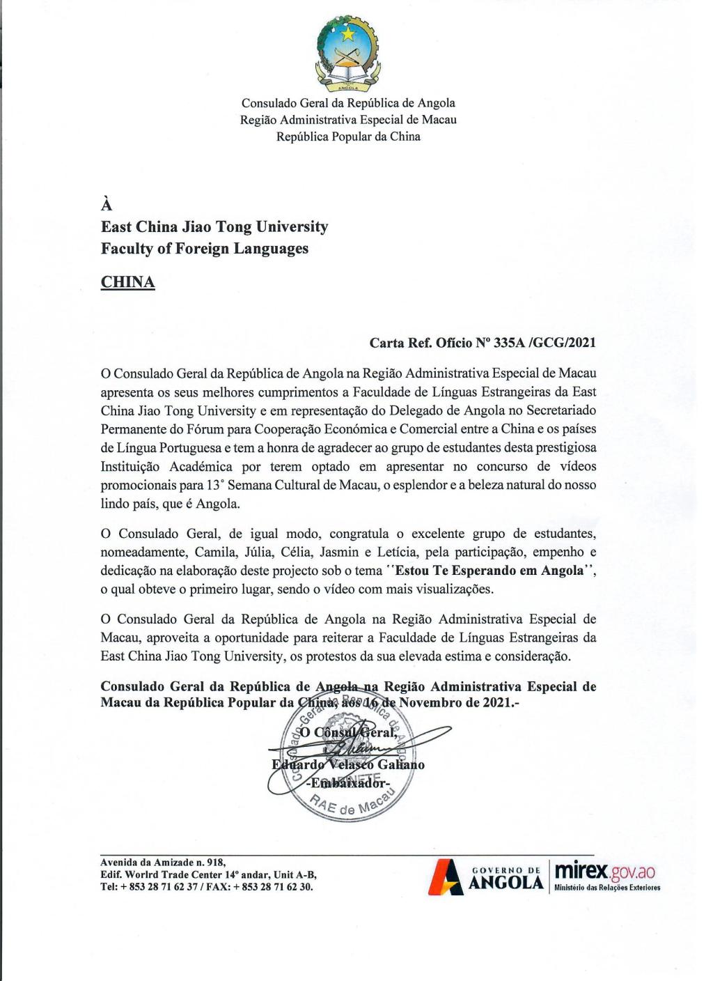 赛后,安哥拉驻澳门特别行政区总领事向我校发函,感谢我校学生向世界展示安哥拉的壮美,同时向获奖团队致以诚挚祝贺,向yl9193永利集团致以崇高敬意。