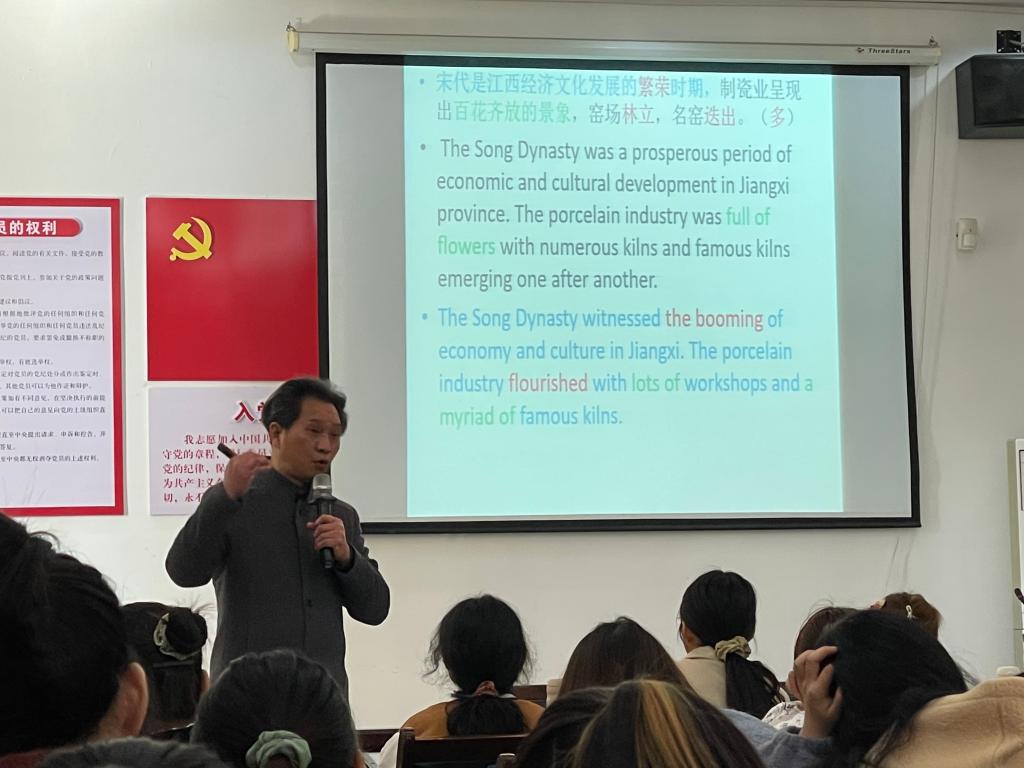 紧接着,余教授带领大家进入本次讲座的重头戏——江西古代陶瓷文化翻译赏析。在讲解过程中,余教授对每一段话都做了多种版本的翻译,循序渐进地带领在场师生向更好的译本前进,并鼓励同学们积极分享自己的翻译作品。余教授在翻译过程中,充分考虑了陶瓷文化的人文历史背景以及广大译文受众的文化水平,始终秉承着“接续传承中华文化”的理念。他提出,对翻译意义的处理过程可分为以下四部分:认识过程→语言过程→意义过程→翻译过程。他鼓励在座的学生们多读文学作品,学习前辈的表达,接续传承文化。余教授还从陶瓷工作者的工匠精神中受到了启发,他表示,译者翻译的作品要对得起读者。这份感悟深刻地体现了余教授对译者这份职业崇高的敬意以及对翻译作品深深的责任感。