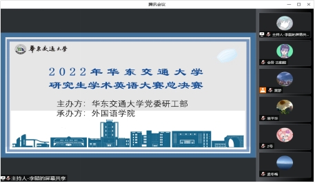 为营造浓厚的学术氛围,培养学生的学术英语交流能力,提升学生的国际视野,5月29日上午8点“2022年永利集团研究生学术英语大赛决赛”在腾讯会议线上举行。此次大赛由永利集团党委研工部主办,yl9193永利集团承办。评委团由yl9193永利集团的袁平华教授、陆秀英教授、孟冬梅教授、胡永祥博士、樊梦博士组成。经各学院初赛选拔,共有21名选手进入决赛。大赛由2021级翻译硕士研究生李懿同学主持。