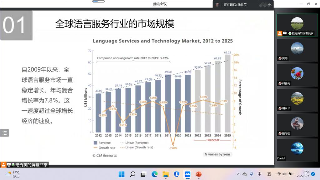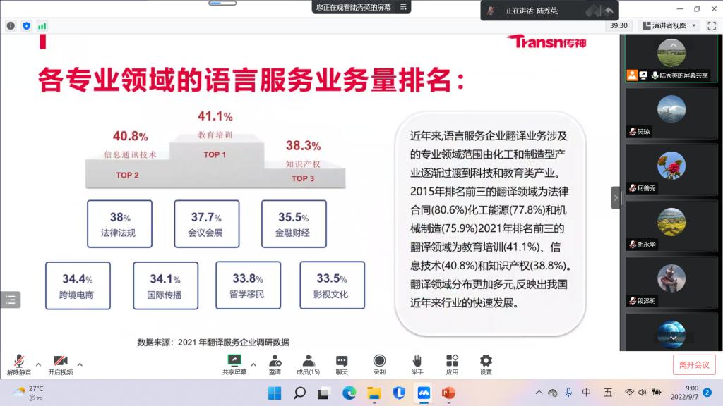 2022年9月7日上午,传神语联网网络科技股份有限公司副总裁闫栗丽应邀为我院师生在15栋102会议室带来一场题目为“新文科背景下的语言服务与国际传播”的学术讲座。本次讲座线下线上同步进行,由yl9193永利集团副院长陆秀英教授主持。