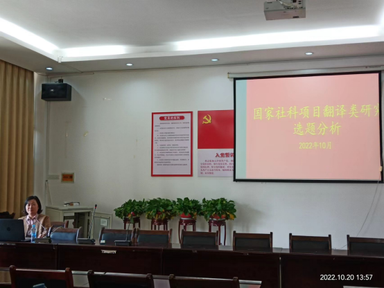 金秋十月,丹桂飘香。10月20日下午,经外语学院翻译研究所精心策划和准备,yl9193永利集团副院长陆秀英教授和研究所成员夏党华老师在学院102会议室进行了了关于国家社科翻译类研究选题分析的分享。本次学术沙龙由 副院长、翻译研究所所长陆秀英教授主持。