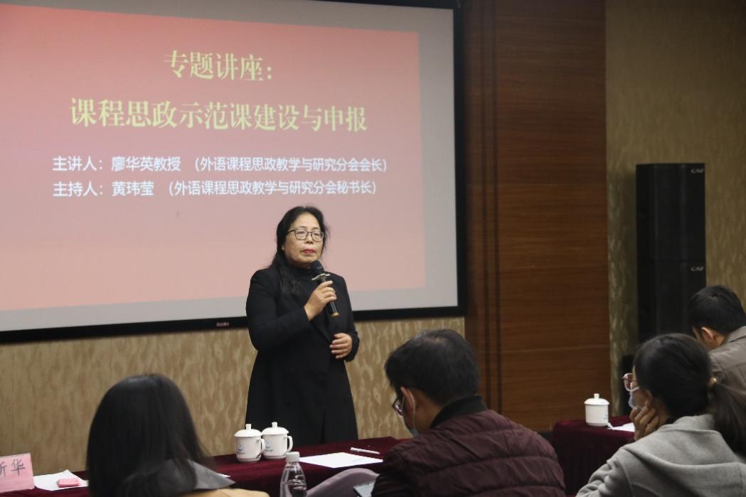 教育部课程思政教学名师、江西省外语课程思政教学与研究分会会长东华理工大学廖华英教授为全体老师做了“课程思政示范课建设与申报”的专题讲座,以“中国文化概况(英)”“一课四金”建设为例,诠释了课程思政示范课的内涵与实现路径,提出了课程思政示范课申报书撰写的常规性问题和解决方案。