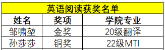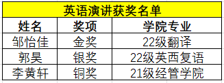 本次大赛,通过线上和线下两轮初赛的激烈角逐,我校共有9名学子荣获佳绩。22级翻译专业邹怡佳在演讲比赛中荣获金奖并成功晋级全国决赛,20级翻译专业邹啸在阅读比赛荣获金奖并成功晋级全国决赛。