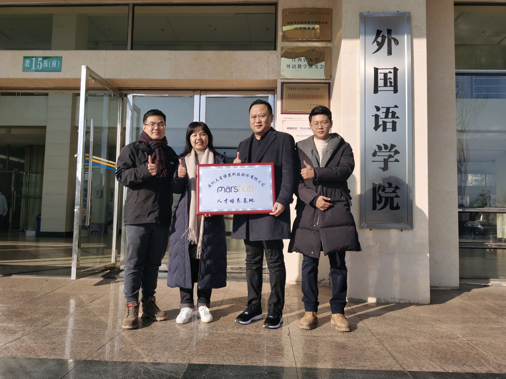 为优化人才输送,加强院企合作,推动持续发展,12月22日,外语学院与深圳市火星语盟科技股份有限公司于外语学院楼举行人才培养基地揭牌仪式。参加本次仪式的有公司副总裁、联合创始人徐徐,外语学院副院长单伟红,院党委组织员郑伟。