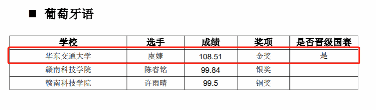在师生共同努力下,我校学子在此次大赛中披荆斩棘,全面绽放。在江西赛区决赛中斩获佳绩,荣获金奖5项、银奖5项、铜奖8项,其中,英语组综合能力选手刘慧君,演讲选手郭昊,口译选手邹怡佳,短视频赛项刘羽茜团队,葡萄牙语组选手虞婕,荣获5项金奖,顺利晋级国赛赛段。