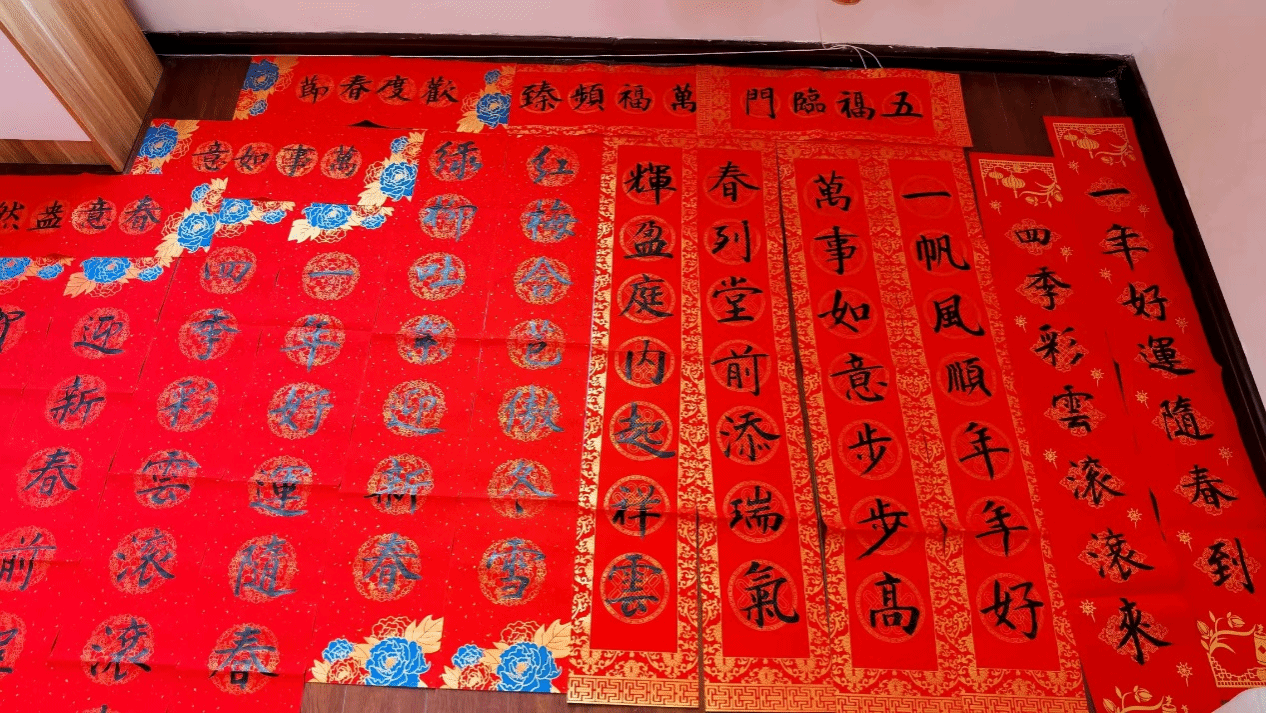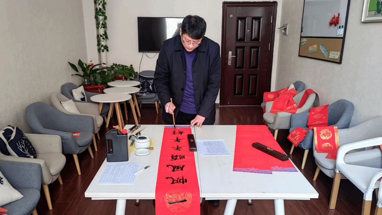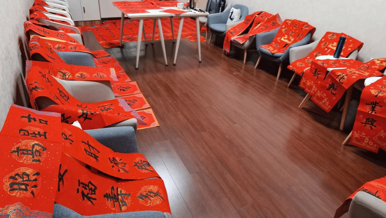 挥毫泼墨罢了,一幅幅春联崭新出炉。师生们纷纷围聚过来,眼中满是对书法艺术的欣赏与喜爱,挑选着一幅幅饱含心意的春联和红彤彤的“福”字,脸上洋溢着幸福的笑容。