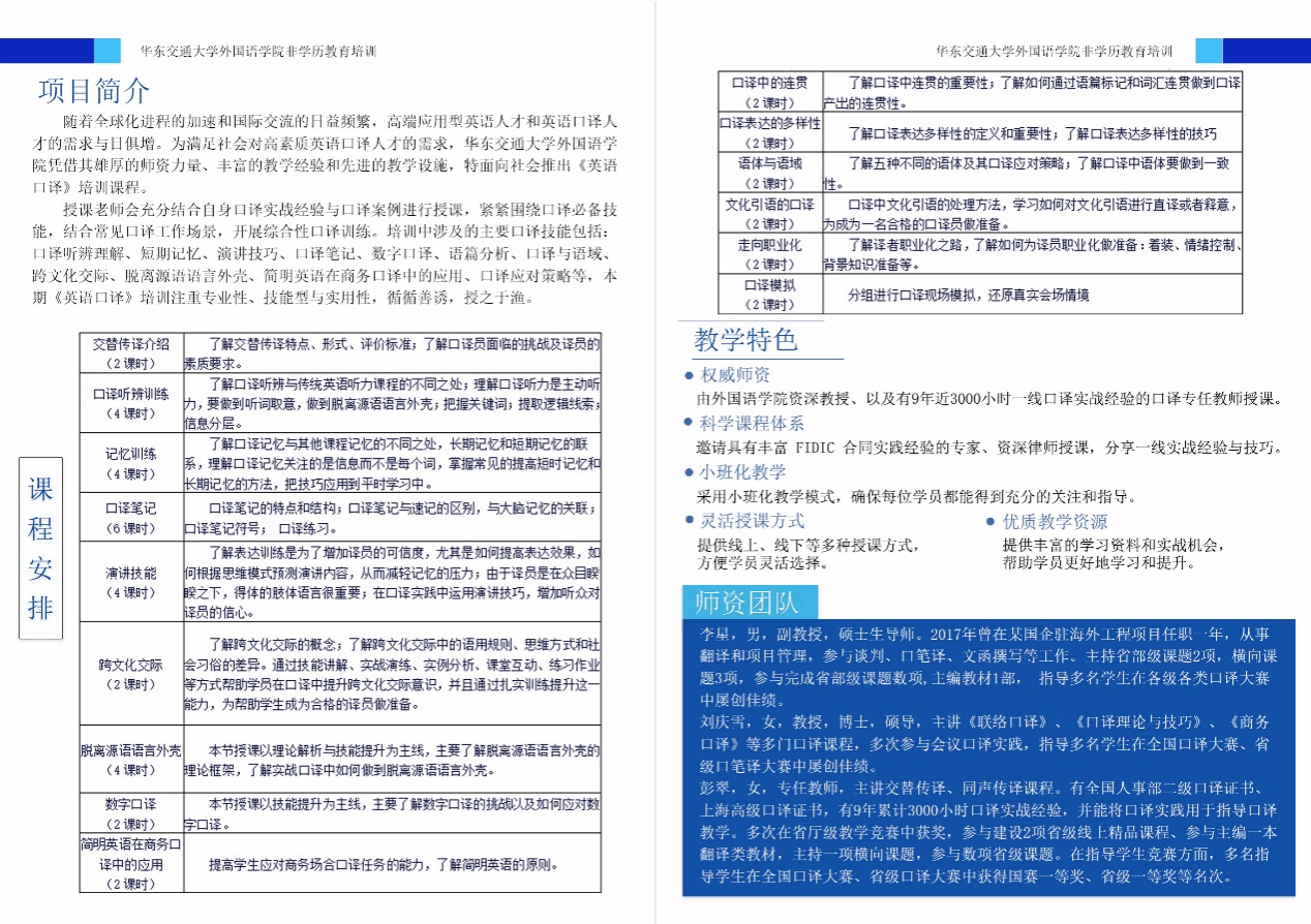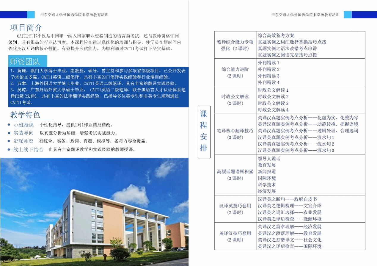 随着全球化进程的加速和国际交流的日益频繁,出国留学人员、高端应用型英语人才及英语口笔译人才的需求与日俱增。为满足社会对高素质英语人才的需求,yl9193永利集团凭借其雄厚的师资力量、丰富的教学经验和先进的教学设施,特面向社会推出《雅思双阶全能冲刺班》、《CATTI二级笔译》、《CATTI三级笔译》及《英语口译》等培训课程。各课程项目简介、课程安排、教学特色及师资团队等详细信息见下图。