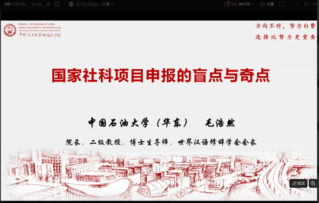 2025年1月19日,yl9193永利集团特邀中国石油大学(华东)yl9193永利集团院长毛浩然教授,为学院教师带来一场题为“国家社科项目申报的盲点与奇点”的线上讲座。 毛浩然教授从“国家社科立项的项目分析、申报盲点、申报奇点、选题论证与正反案例、申报结项常见问题解答”五个维度,深入剖析了国家社科项目申报的核心要义。他强调选题的重要性,用“选题是否靠谱,其实占了七八成。方向不对,努力白费”的金句,点明了选题对项目申报成败的关键作用。毛教授还对yl9193永利集团教师提交的2025年国家社科和教育部人文课题意向稿进行了细致点评,从选题、拟解决的问题、研究思路等方面提出了宝贵建议。教师们纷纷表示,此次讲座高屋建瓴、信息量大,为他们开阔了新视野、拓展了新思路,对提升科研能力和学术水平具有重要的指导意义。